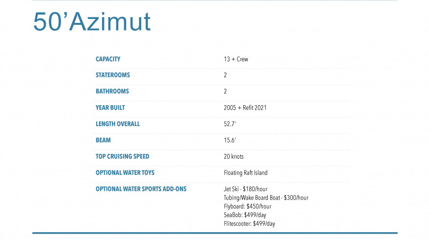 Azimut 50' rental starting at $1,565 for 2 hours.